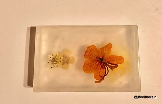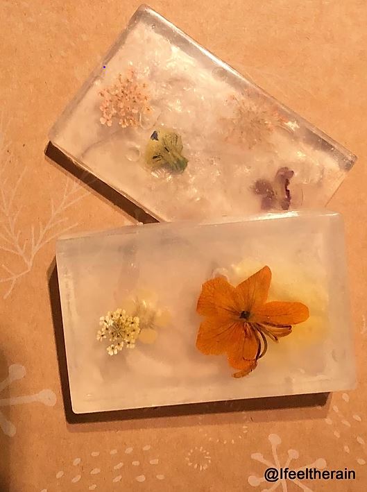 Le savon à mouler se présente sous la forme d’un bloc de savon transparent qu’il faudra faire fondre. Il permet de faire des savons selon nos envies : pailletées, fleuris, colorés ou parfumés.Il me restait des fleurs pressées suite à la réalisation de vide-poches : j’ai réalisé un savon dans les tons de l’automne et un savon dans les tons roses/violets. Le tuto est très facile : il faut faire fondre le savon au bain marie. Pendant ce temps, on place quelques fleurs pressées dans le fond du moule à l’aide d’une petite pince (une pince à épiler fera largement l’affaire). Une fois le savon fondu, on verse une petite partie du savon dans le moule. On attend que la couche durcisse un peu pour éviter que les fleurs bougent, puis on verse presque entièrement le reste du savon. Rajouter quelques fleurs puis recouvrez-les avec le reste de savon.
