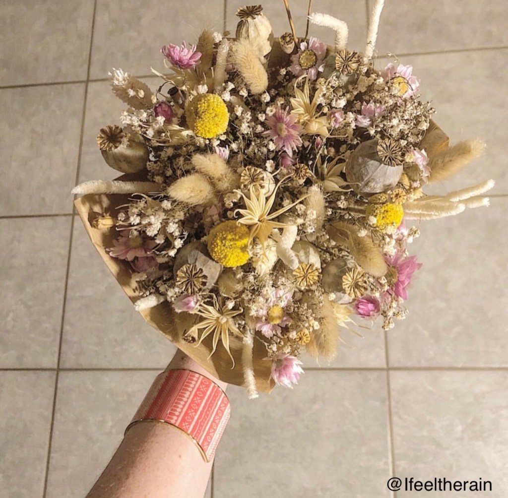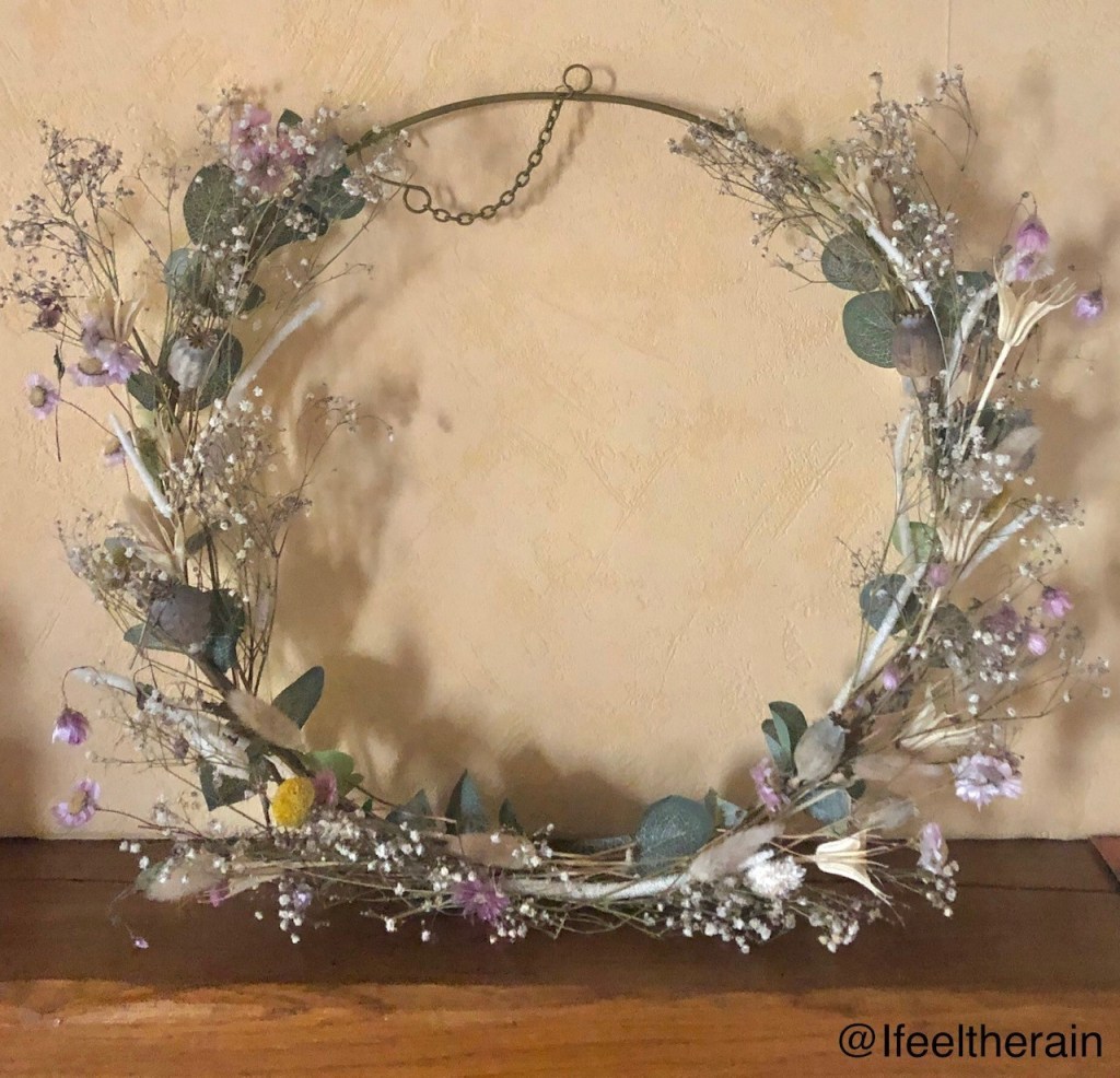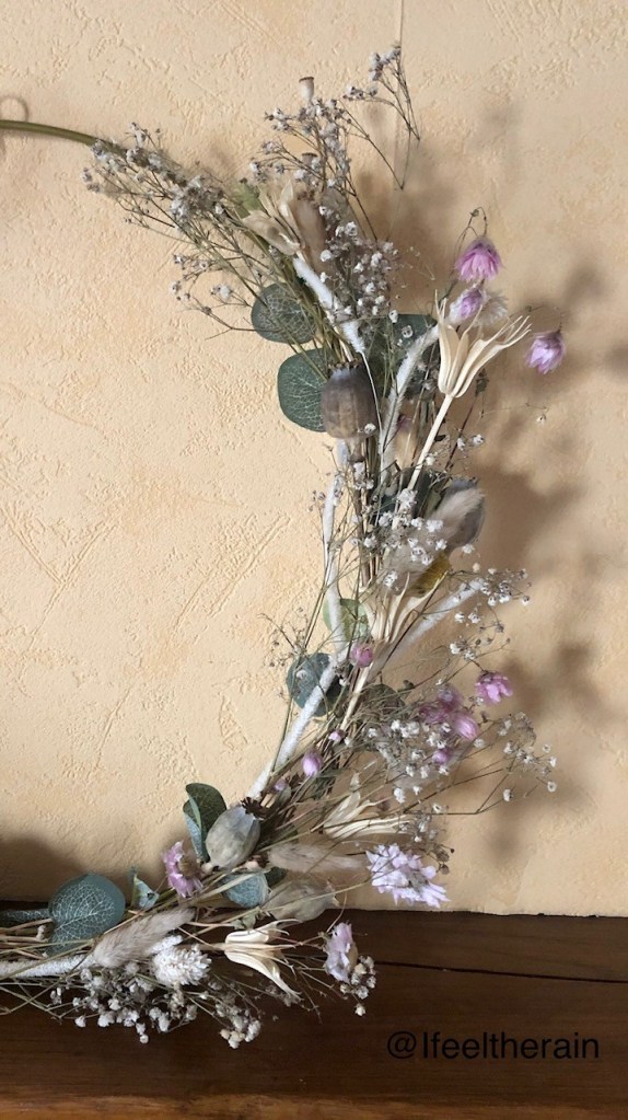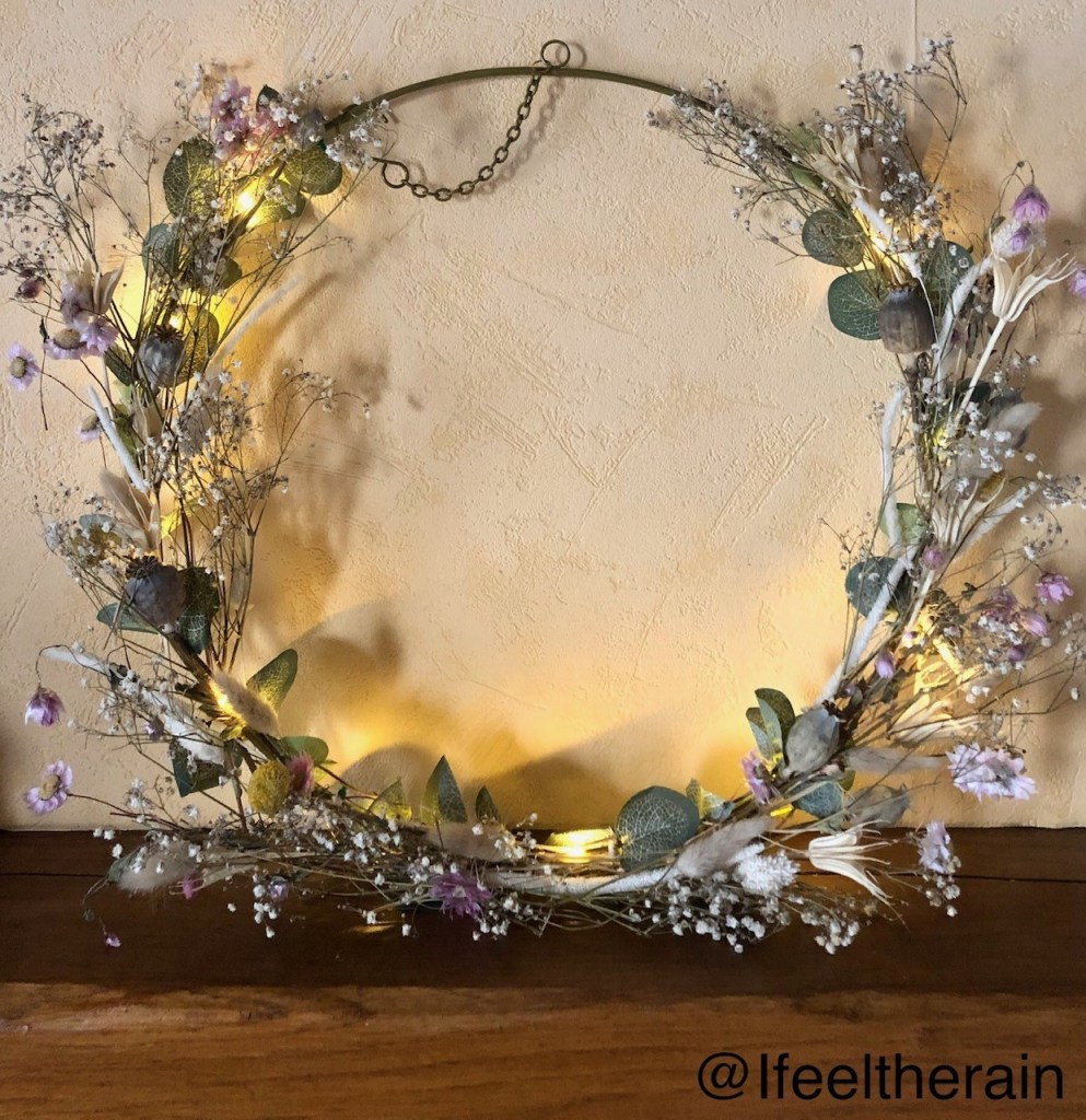 J’ai trouvé par le plus grand des hasards un cercle en métal avec des fausses feuilles d’eucalyptus et une guirlande lumineuse à Centrakor. J’ai acheté un bouquet de fleurs séchés sur la jolie boutique française Le Flower Truck sur Etsy pour décorer le cercle.