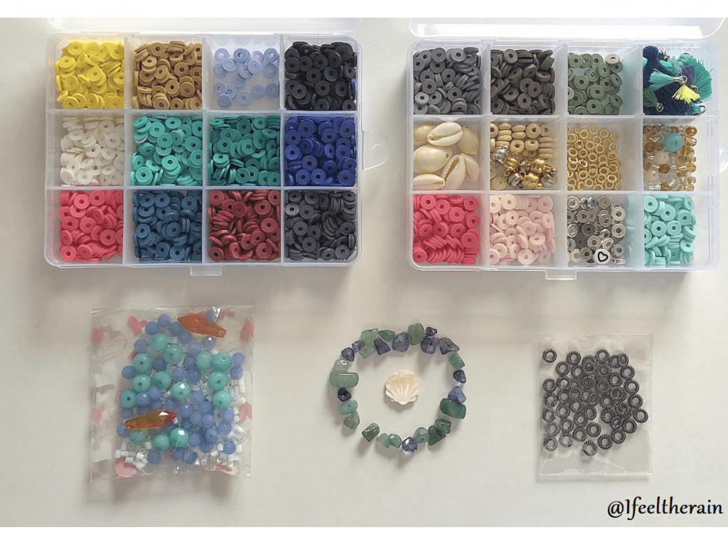 Recevoir ce kit m’a redonné envie de réaliser ces bracelets que j’avais déjà fait l’année dernière. J’ai donc ressorti tout mon matériel avec grand plaisir et j’ai passé mon dimanche matin à réaliser de nouvelles associations de perles. J’ai aussi sorti les perles que j’avais reçu dans d’autres kits.